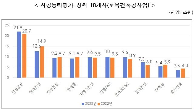 (Seoul=NSP NEWS AGENCY) = 在2023年度施工能力评价中,三星物产和现代建设稳居前两位。但是HDC现代产业开发公司却跌出了前十名,湖畔建设排在十位。