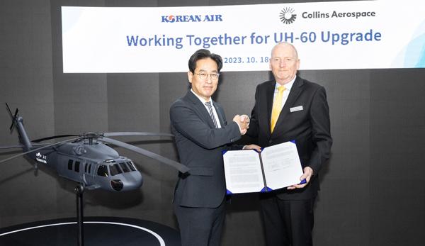 大韩航空和柯林斯公司18日上午在京畿城南市首尔机场举行的"2023首尔国际航空航天防务展(Seoul ADEX 2023)"上签署了UH-60一份谅解备忘录(MOU),以双方对性能升级UH-60直升机进行合作。