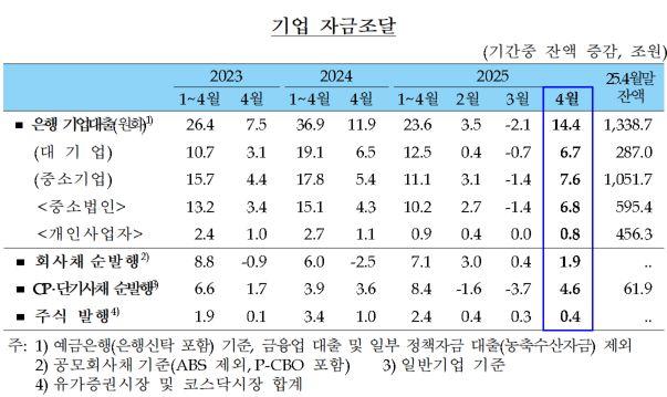 根据韩国银行14日发布的《2025年4月金融市场动向》报告,上个月银行企业贷款增加了14.4万亿韩元,从前一个月减少2.1万亿韩元转为大幅增加。