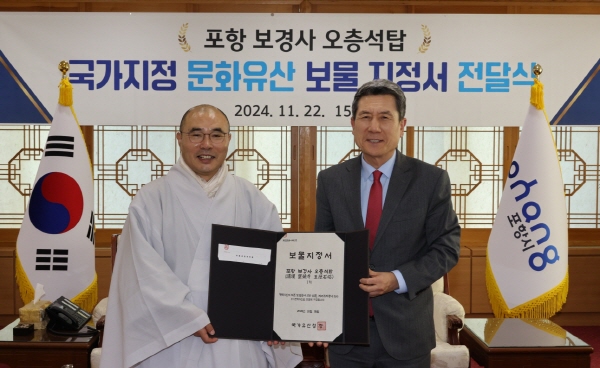 (경북=NSP통신) 조인호 기자 = 포항시는 22일 시청 대외협력실에서 국가지정 문화유산 보물에 지정된 ‘포항 보경사 오층석탑’의 보물 지정서 전달식을 개최했다.