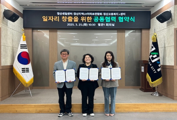 (경북=NSP통신) 김대원 기자 = 경산시(시장 조현일)가 운영하는 경산여성새로일하기센터는 25일 경산시청 별관1 회의실에서 경산지역 LH아파트연합회, 경산고용복지⁺센터와 함께 ‘일자리 창출을 위한 공동협력 협약’을 체결했다.