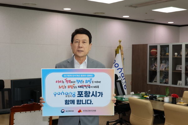 (경북=NSP통신) 조인호 기자 = 이강덕 포항시장이 21일 ‘인구문제 인식 개선 릴레이 캠페인’에 참여하며 저출생·고령화 등 인구문제에 대한 사회적 공감대 확산에 힘을 보탰다.