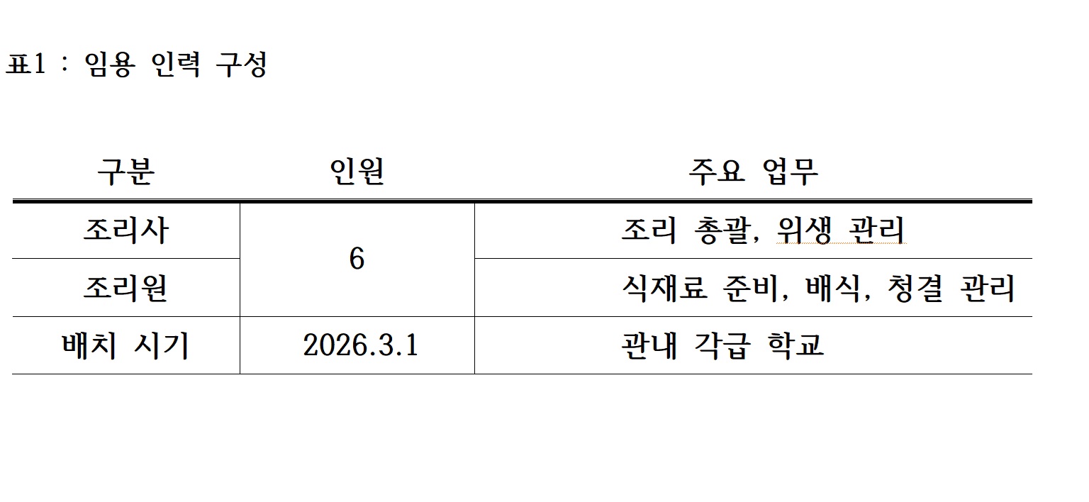 상주교육지원청은 신학기 전 인력 충원을 통해 급식 운영 안정성을 확보하려는 것으로 보인다. 특히 조리사 인력 확보는 조리실 총괄 관리 책임을 명확히 하는 효과가 있다.