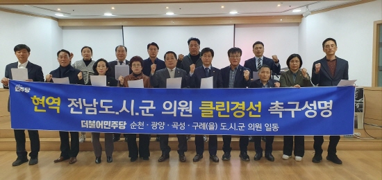 (전남=NSP통신) 김성철 기자 = 더불어민주당 순천·광양·곡성·구례을 지역위원회 소속된 있는 현역 시·군·도의원 24명은 광양시새마을금고 3층에서 성명을 발표하고 “클린경선을 펼칠 것을 촉구한다”고 밝혔다.
