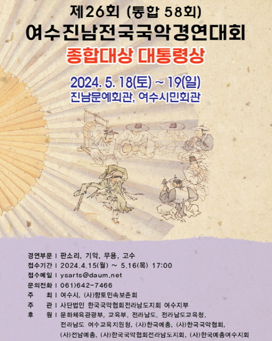 (전남=NSP통신) 서순곤 기자 = 여수시가 오는 18~19일 진남문예회관에서 ‘제26회 여수진남 전국 국악경연대회’를 개최한다.