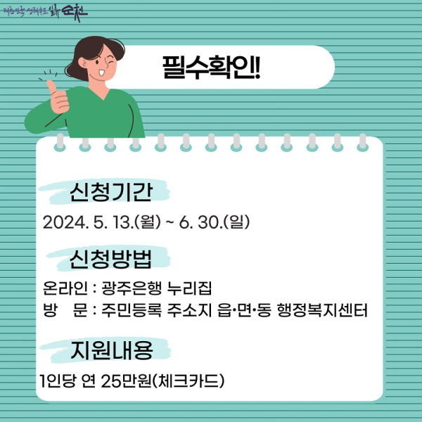 신청방법은 광주은행 누리집을 통해 온라인으로 신청하거나 주민등록 주소지 관할 읍‧면‧동 행정복지센터를 방문하여 신청하면 된다.