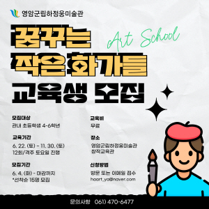 (전남=NSP통신) 강현희 기자 = 영암군립하정웅미술관이 다음달 4일부터 시작하는 공공미술교육 ‘꿈꾸는 작은 화가들’에 참여할 4~6학년 영암 초등학생 15명을 선착순 모집한다.