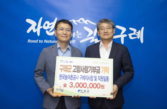 (전남=NSP통신) 김성철 기자 = 한국농어촌공사 구례지사(지사장 임성재)는 작년에 이어 올해도 구례군의 지속적 발전과 성장을 응원하는 구례지사 직원과 전남지역본부 내근 직원들의 마음을 모아 구례군에 고향사랑기부금 300만 원을 기탁했다고 밝혔다.