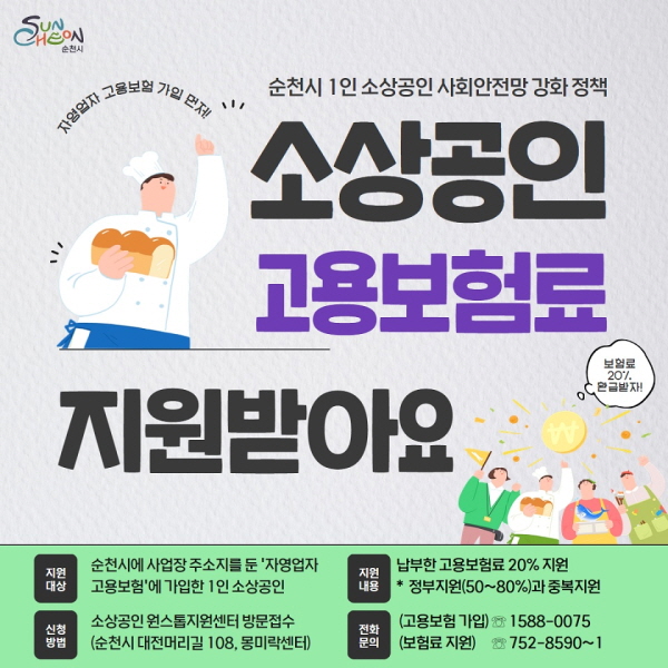 지원대상은 자영업자 고용보험에 가입한 순천시 소재 1인 소상공인으로, 소상공인이 먼저 근로복지공단에 고용보험 가입 후 순천시에 지원 신청하면 된다.