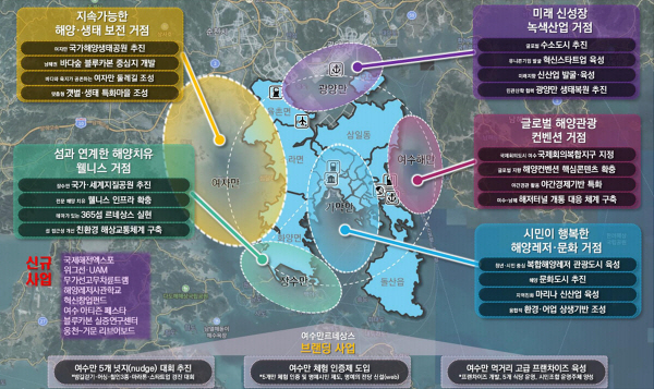 각 만의 특성을 살려 ▲지속가능한 해양·생태 보전거점 ‘여자만’ ▲해양치유 웰니스 거점 ‘장수만’ ▲해양레저·문화 거점 ‘가막만’ ▲해양관광과 컨벤션 ‘여수해만’ ▲미래 신성장 녹색산업 거점 ‘광양만’ 등으로 보전·개발한다.