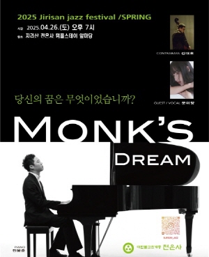 (전남=NSP통신) 김성철 기자 = 구례 지리산 천은사(주지 대진 스님)는 오는 4월 26일 오후 7시 경내 템플스테이 앞마당에서 ‘2025 지리산 재즈 페스티벌 봄’을 개최한다. 이번 공연의 제목은 ‘Monk’s Dream’이다.