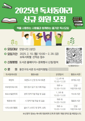 (경기=NSP통신) 김해종 기자 = 경기 안양시(시장 최대호) 동안구도서관은 독서를 좋아하는 시민을 대상으로 독서동아리 신규회원을 모집한다.