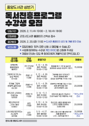 이번 상반기 독서진흥프로그램은 어린이 및 성인을 대상으로 6개 강좌로 구성돼 2026년 3월 9일부터 5월 2일까지 진행될 예정이다.