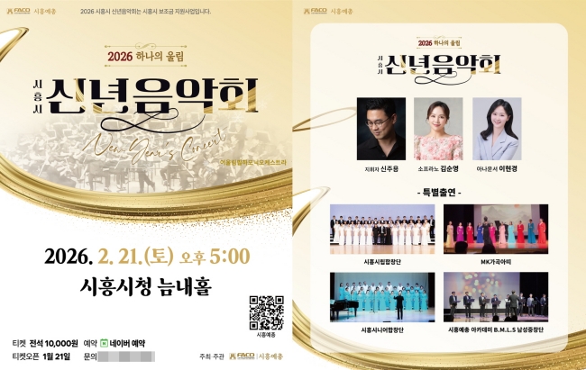 (경기=NSP통신) 서국현 기자 = 경기 시흥시(시장 임병택)가 지원하고 한국예술문화단체총연합회 시흥지회에서 주관하는 ‘2026 시흥시 신년음악회-하나의 울림’이 오는 21일 오후 5시 시청 늠내홀에서 개최된다.