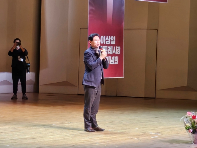 이상일 용인특례시장이 7일 오후 용인시 소재 단국대 죽전캠퍼스 난파음악당에서 열린 출판기념회에서 인사말을 하고 있다. (사진 = 김병관 기자)