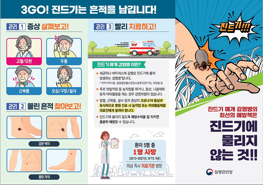 중증열성혈소판감소증후군의 경우 다른 감염병에 비해 치명률(2013~2022년 국내 누적치명률 18.7%)이 높으며 이를 유발하는 참진드기가 3월부터 활동하기 때문에 진드기에 물리지 않도록 주의가 필요하다.