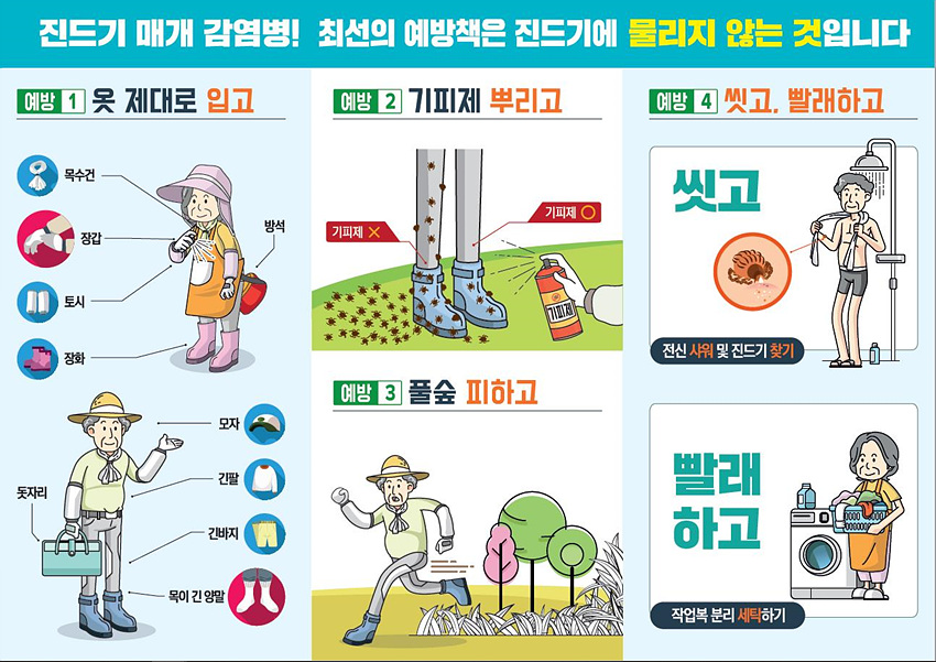 농작업 등 야외활동 시 진드기에 물리지 않기 위해 긴 옷, 긴 바지, 모자, 목수건, 장갑 등을 착용해 피부노출을 최소화 하고 기피제를 사용해야 한다.