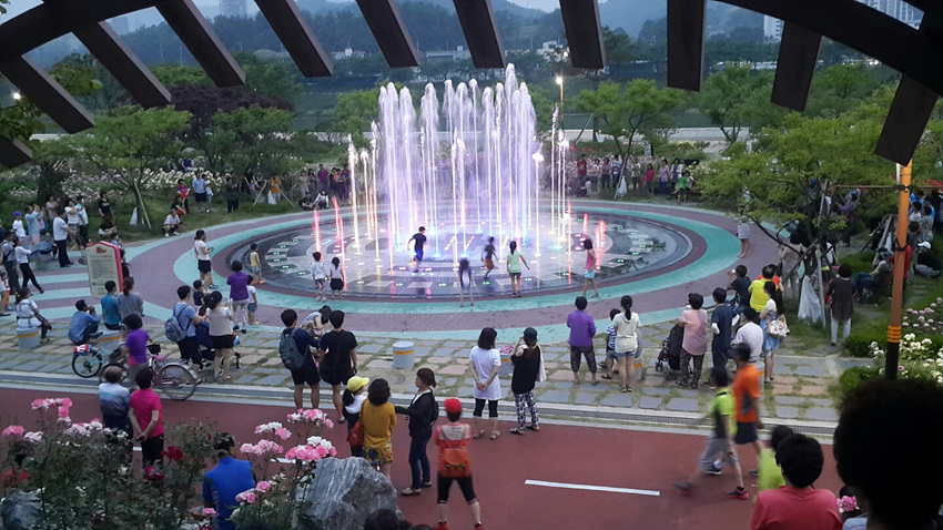 장미공원 바닥분수는 물놀이형 바닥분수로 매주 월요일을 제외하고 오전 10시 15분부터 운영을 시작하고 야간에도 오후 8시 15분까지 운영하며 아름다운 조명과 시원한 물로 무더위에 지친 관광객과 시민들을 맞이한다.