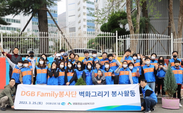 (대구=NSP통신) 최병수 기자 = DGB금융그룹(139130)은 지난 25일 ‘DGB Family봉사단’ 주말 봉사활동으로 대구시 수성구 범물동에 소재한 용지아파트 단지 내 벽화 그리기를 진행했다.
