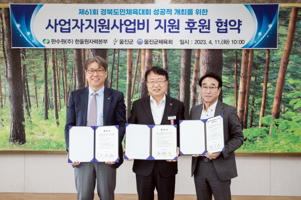 (경북=NSP통신) 조인호 기자 = 한국수력원자력 한울원자력본부(본부장 박범수)는 11일 울진군청에서 울진군, 울진군체육회와 ‘제61회 경북도민체육대회 개최 및 울진군선수단 지원사업’ 협약식을 가졌다.