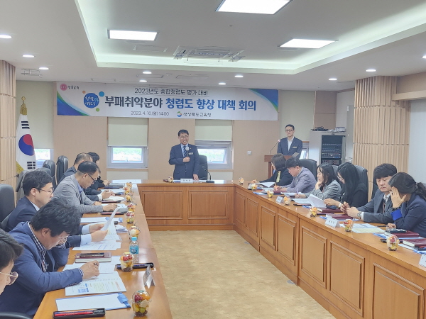 (경북=NSP통신) 조인호 기자 = 경상북도교육청(교육감 임종식)은 지난 10일 본청 부서별 업무 담당자 및 팀장 20여 명을 대상으로 ‘2023년도 부패 취약분야 청렴도 향상 대책 회의’ 를 실시했다고 밝혔다.