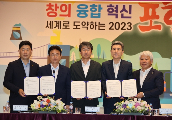 NSP통신-에코프로는 13일 포항시청 대회의실에서 경상북도, 포항시와 이차전지 양극소재 신규 생산 공장 건립을 위한 양해각서를 체결했다.(왼쪽부터)박용선 경북도의회 부의장, 이철우 경북도지사, 송호준 에코프로 대표이사, 이강덕 포항시장, 백인규 포항시의회 의장 (사진 = 포항시)