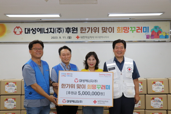 (대구=NSP통신) 최병수 기자 = 대성에너지(117580)는 11일 대한적십자사 대구지사(회장 박명수) 1층 강당에서 ‘한가위 맞이 희망꾸러미’ 나눔 활동에 참여하고 후원금을 전달했다.