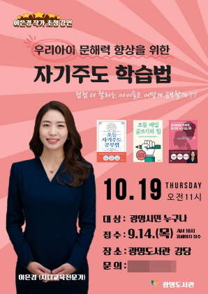 (경기=NSP통신) 김여울 기자 = 경기 광명시 광명도서관은 10월 19일 오전 11시 도서관 강당에서 ‘우리아이 문해력 향상을 위한 자기주도 학습법’을 주제로 아카데미 특별강연회를 개최한다.