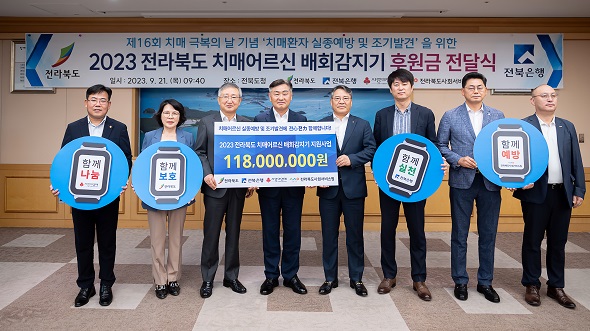 (전북=NSP통신) 김광석 기자 = JB금융그룹 전북은행(은행장 백종일)은 21일 전북도청 도지사실에서 2023 전라북도 치매어르신 배회감지기 지원사업 후원금 1억 1800만원 전달식을 실시했다고 밝혔다.