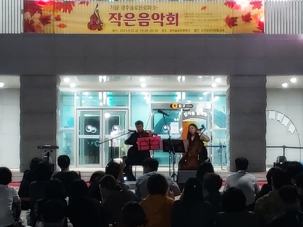 (전남=NSP통신) 김용재 기자 = 광주솔로몬로파크(센터장 임춘덕)가 지난 22일 가을을 주제로 한 작은 음악회를 갖고 코로나19 등으로 지친 광주시민들에게 힐링의 시간을 선사했다.