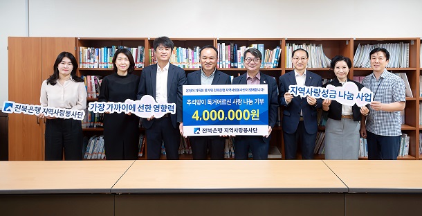 한편 전북은행은 지역사랑성금 나눔 이외에도 2000만원 상당 ‘추석맞이 전통시장 장보기행사’ 및 ‘一石二鳥 추석나눔’ 사업 등 향토은행으로서 다양한 사회공헌사업을 펼치며 이웃사랑을 실천해 지역사회를 훈훈하게 하고 있다.