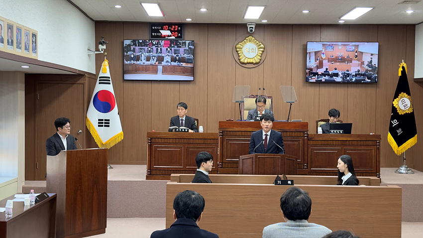 NSP통신-한종우 김포시의원이 24일 제229회 김포시의회 본회의에서 김병수 시장에게 보충 질문을 하고 있는 모습. (사진 = 조이호 기자)