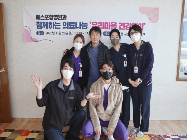 에스포항병원은 신경외과 양중원 진료부장을 비롯해 간호사, 물리치료사, 행정직 등의 봉사팀이 구룡포읍 구평3리 마을회관을 방문해 기초 건강 체크 및 건강상담, 물리치료 등의 의료봉사를 실시하며 신체적, 정신적 건강증진에 기여하는 뜻깊은 시간을 가졌다.