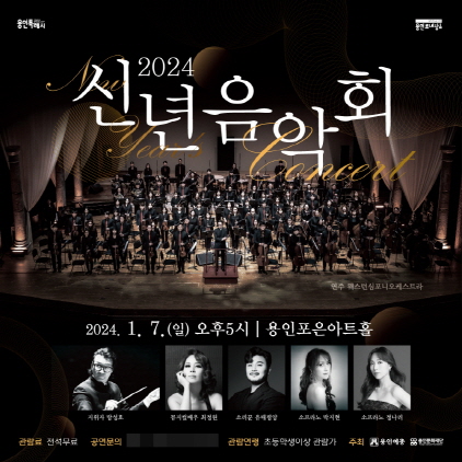 2024년 신년음악회 ‘NEW YEAR'S CONCERT 2024’는 전석 무료로 진행되며 용인예총 사무국으로 문의하거나 용인문화재단 홈페이지에서 확인할 수 있다.