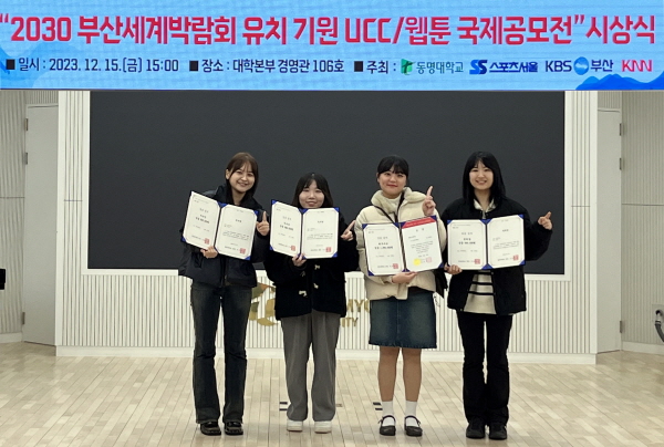 계명대 웹툰전공 학생들이 '2030 부산세계박람회 유치 기원 국제공모전'에서 최우수상을 비롯해 우수상과 장려상 등 대회를 휩쓸었다(좌측부터 계명대 웹툰전공 1학년 김시현(우수상), 이예은(우수상), 박경은(최우수상), 김민서(장려상) 순) (사진 = 계명대학교)