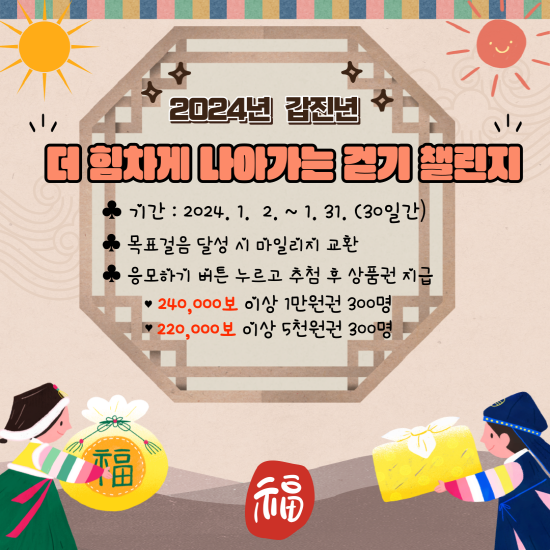 1월 2일~31일까지 진행되는 이번 걷기 챌린지는 1걸음 당 1마일리지 적립으로 1일 최대 8천 마일리지가 누적되며 목표 마일리지 달성 시 쿠폰 교환이 가능하다.