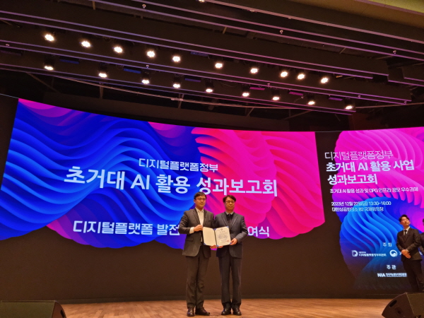 (경북=NSP통신) 최병수 기자 = 대구대학교 구덕본 교수가 지난 22일 서울 대한상공회의소 국제회의장에서 열린 ‘디지털플랫폼정부 초거대 AI 활용 사업 성과보고회’ 행사에서 디지털플랫폼 발전 유공자로 선정돼 과학기술정보통신부 장관상을 수상했다.