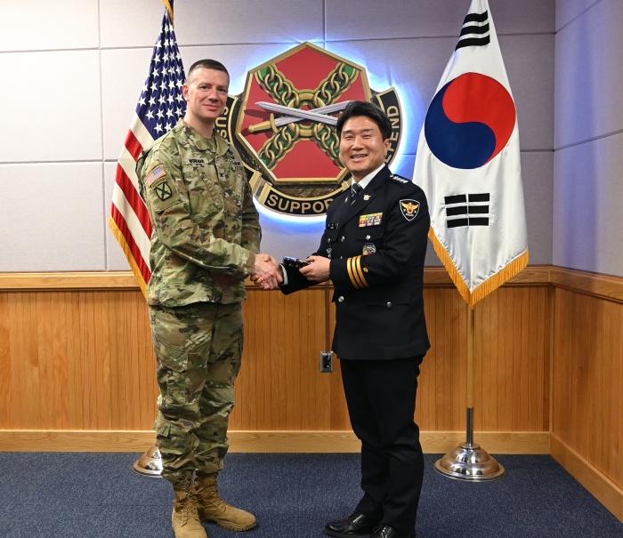 (경기=NSP통신) 김병관 기자 = 미 육군 험프리스 기지 라이언 워크맨 사령관은 6일 새로 부임한 장정진 평택 경찰서장을 접견해 험프리스 기지와 평택 경찰서 간 지속적인 협력 방안을 모색했다.