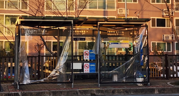 (전남=NSP통신) 강현희 기자 = 광양시가 대중교통 승하차장에 설치한 구조물이 지난 8일 강풍으로 인해 갈기갈기 찢겨졌지만 흉물스럽게 방치되고 있어 미간을 찌푸리게 하고 있다.
