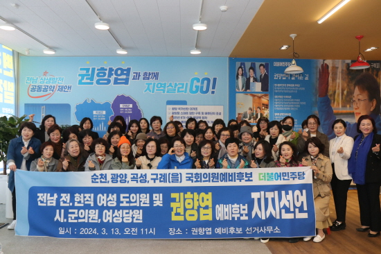 한편 이번 전남 전·현직 여성 도의원 및 시·군의원, 여성당원 권향엽 국회의원 예비후보 지지선언에는 강정희 전)전남도의회 의원, 김복실 전)전남도의회 의원, 김성희 전)광양시의회 의장, 김수미 전)목포시의회 의원, 민경매 현)해남군의회 의원, 여성 당원 등 30여 명이 참석했으며 3월 15~16일 경선에 권향엽 후보에 대한 지지를 호소했다.