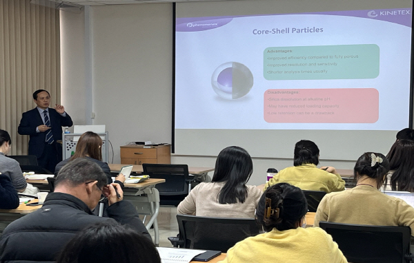 세미나 현장에는 연구원 30여 명이 참석한 가운데 크로마토그래피 컬럼(Column) 전문생산기업인 페노메넥스(Phenomenex)의 한국 총판 성문시스텍 담당자가 HPLC의 체계적이고 현실적인 분석법에 대한 교육을 진행했다.