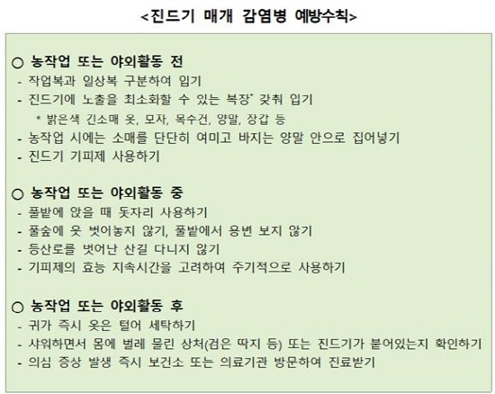 예방수칙으로는 ▲야외활동 전 모자, 긴팔, 긴바지, 등산화, 목수건, 장갑, 목이 긴 양말 착용으로 피부 노출 최소화하기 ▲진드기 기피제 뿌리기 ▲야외에서는 돗자리 등 깔고 앉기 ▲야외활동 후 털고, 씻고, 세탁하기 등이 있다.