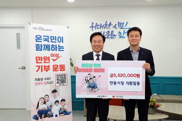 안동시청에서는 경상북도의 저출생과의 전쟁 선포(24.1.18.)에 따라 ‘경북 저출생 극복 성금모금 캠페인’의 일환으로 전개되고 있는, ‘온국민이 함께하는 만원(이상) 기부 운동’에 공직자가 솔선하고자 자발적인 모금을 진행했고 그 결과 총 552만 원을 모금했다.