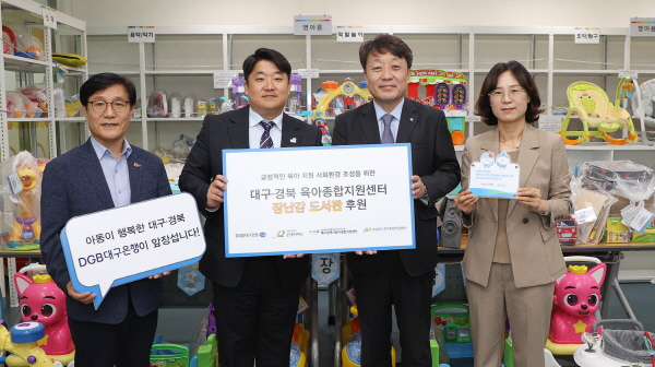 이날 DGB대구은행이 전달한 후원금은 많은 가정의 아동들이 다양한 장난감 대여 서비스를 제공 받을 수 있도록 대구·경북 소재 육아종합지원센터(장난감 도서관) 8개소의 장난감 구비 지원으로 쓰일 예정이다.