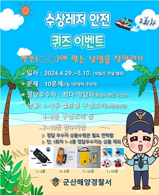 (전북=NSP통신) 김광석 기자 = 전북 군산해양경찰서(서장 박경채)가 29일부터 다음달 10일까지 ‘수상레저 안전 퀴즈 이벤트’를 진행 한다고 밝혔다.