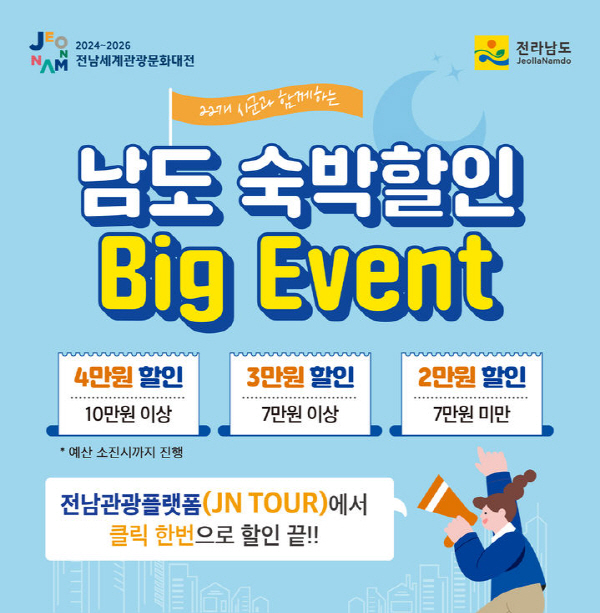 남도 숙박할인 BIG 이벤트 사업은 전라남도·광주광역시 외 주소를 둔 관광객이 고흥군 관내 소재 지정된 숙박업소 이용 시 전남관광플랫폼(JNTOUR) 앱에서 예약 및 결제 시 숙박 요금을 차등 지원(할인)하는 사업이다.