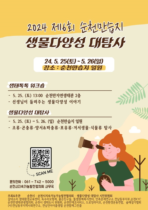 (전남=NSP통신) 남정민 기자 = 전남 순천시(시장 노관규)는 오는 25일부터 26일까지 이틀간 ‘제6회 순천시민 생물다양성 대탐사’를 순천만습지에서 개최한다고 14일 밝혔다.
