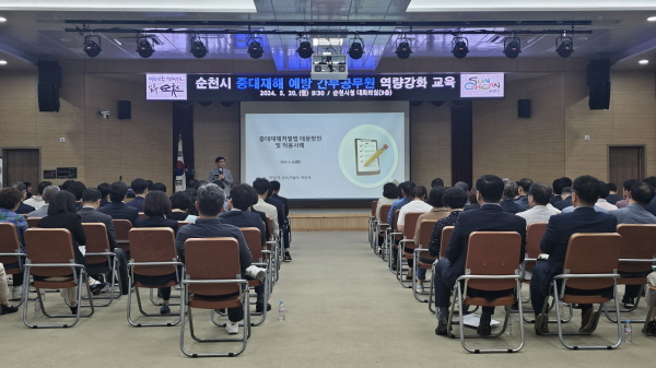 (전남=NSP통신) 남정민 기자 = 전남 순천시(시장 노관규)는 지난 20일 시청 대회의실에서 국․과장 등 5급 이상 간부공무원 90명을 대상으로 ‘2024년 순천시 중대재해 예방을 위한 간부공무원 역량강화 특별교육’을 실시했다고 밝혔다.
