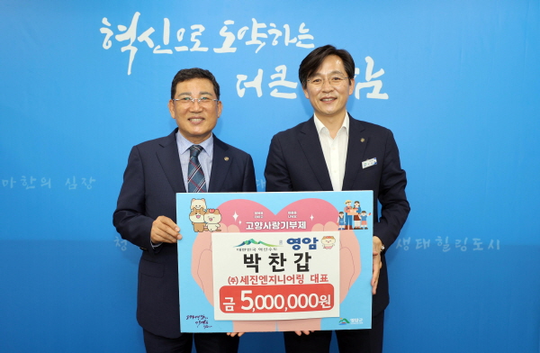 (전남=NSP통신) 강현희 기자 = 박찬갑 세진엔지니어링 대표가 23일 영암군청을 찾아 지역발전을 위해 써달라며 고향사랑기금 500만원을 기부했다.