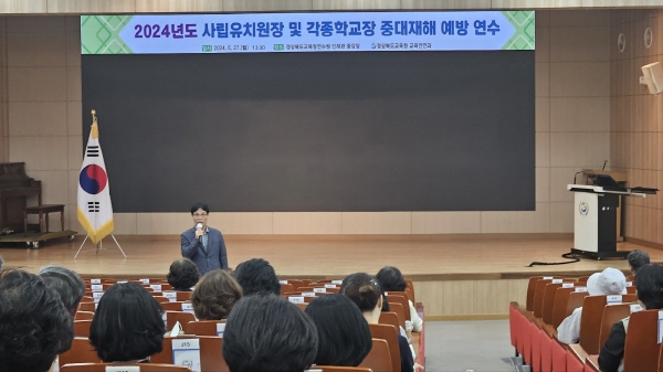 (경북=NSP통신) 조인호 기자 = 경상북도교육청(교육감 임종식)은 27일 구미시에 있는 경상북도교육청연수원 인재관에서 도내 사립유치원장과 각종 학교장 등 130여 명이 참석한 가운데 중대 재해 예방 연수를 시행했다.